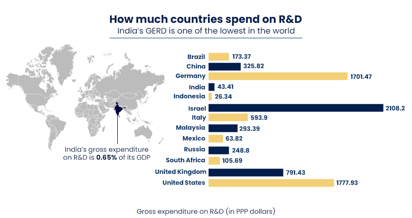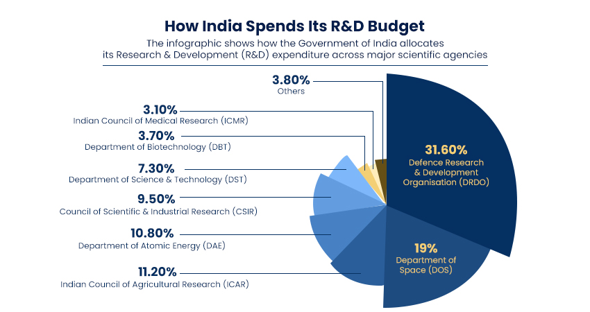 This “chicken-and-egg” problem forced many of India’s brightest minds to either pivot to less ambitious software models or move their headquarters to Silicon Valley or Singapore, where patient capital was more abundant. In 2025, India’s gross expenditure on Research & Development (R&D) stood at a modest 0.64 % of GDP. This is significantly lower than global peers such as China (2.41 %), the United States (3.47 %), and Israel (5.71 %). Meanwhile, the private sector’s contribution was only about 36.4 % of India’s total R&D spend, compared with 70 – 90 % in advanced innovation economies. This disparity has long constrained India’s ability to translate scientific potential into industrial leadership.