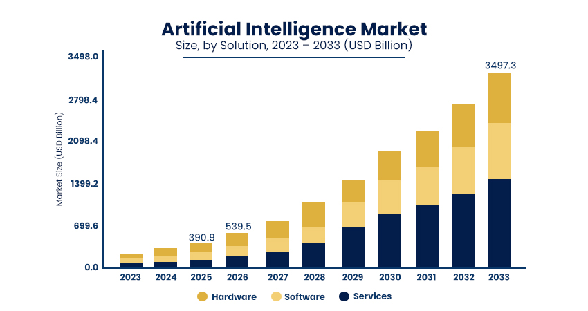This shift matters because AI is rapidly becoming infrastructure rather than innovation. The global AI market, valued at roughly USD 390 billion in 2025, is projected to grow beyond USD 3.4 trillion by 2033, with compound annual growth exceeding 30%. PwC also estimates AI could add up to USD 15.7 trillion to global GDP by 2030, making it arguably the largest commercial opportunity of the modern economy.